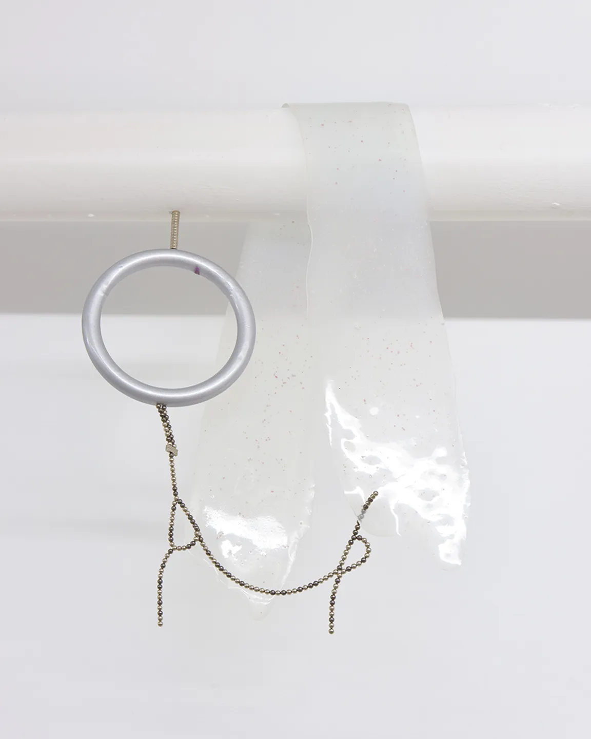 In his film Fsision, 2015, Meres analyzes the life of microscopic planarians (hermaphroditic flatworms with an unusual ability to regenerate lost body parts and to divide themselves into differentiated worms) as a perspective for reproduction and gender beyond the anthropocentric view. In the film, the planarians drift in a petri dish, rubbing against glass and one another, bathed in varying light sources that diffract the visual contours of the space in which they exist, altering our perception of their size and location. Shot at a laboratory at the New School, Meres’s Fsision is a quiet and complex essay into the production of difference—and the notion of individuality as it forms in an alien territory that nevertheless closely resembles ours. In reproducing by splitting into two or many, planarians offer alternative views to human conceptions of identity as well as assumptions about originality and authenticity. This inquiry is extended in his series of silicone sculptures that hang from the ceiling and refer, in their torqued, elongated form, to the bodies of mutating planarians. Cast with synthetic testosterone and performance enhancing supplements designed to transform the human body, the works are draped on hardware extended from the ceiling and extend the muscle-less and one-dimensional planarian form to a fleshy manifold state.